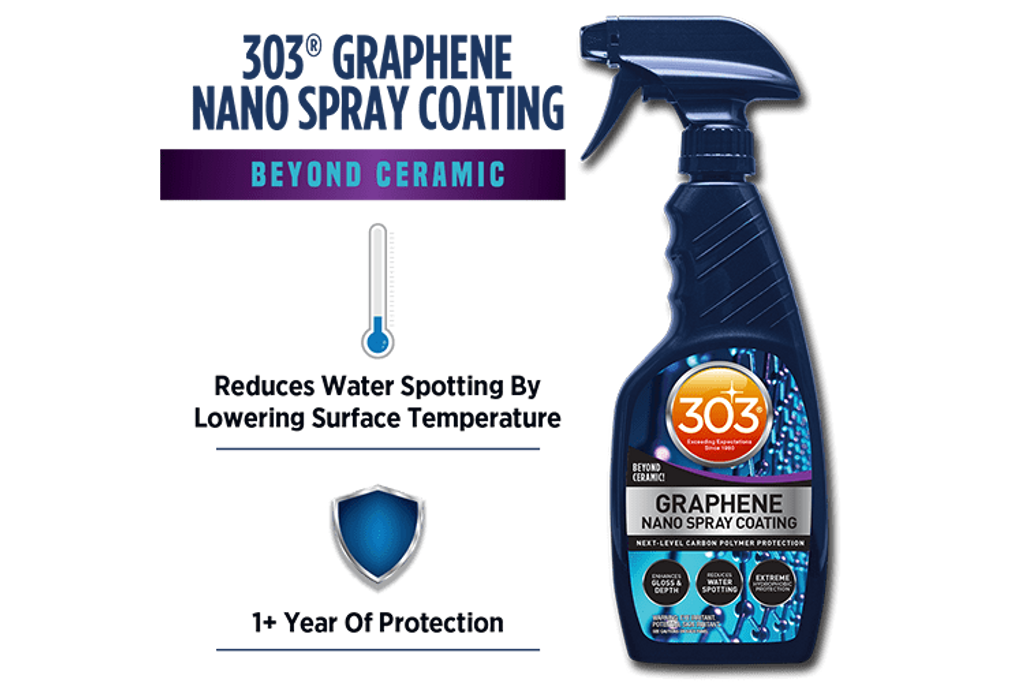 303 Graphene Nano Spray Coating är ett lackskydd baserad på grafenoxid som erbjuder förstklassigt skydd i upp till ett år. Den har hydrofoba egenskaper och tack vare Grafen så är den inte lika känslig för vattenfläckar och förbättrar både glans och klarhet. Sprayen är enkel att använda och kan appliceras på en mängd olika ytor.