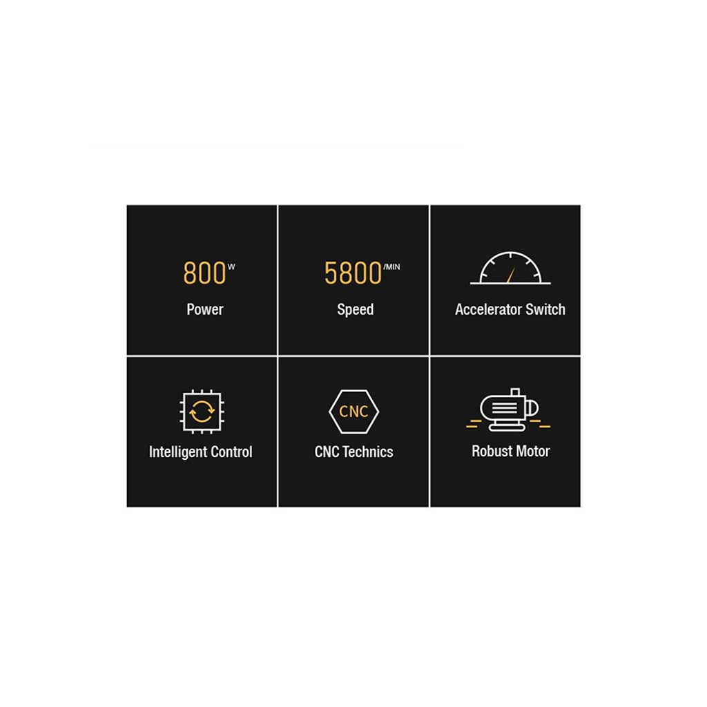 Maskinen är utrustad med en kraftfull motor som har en maximal effekt på 800 W. Denna motor är designad för att leverera en konstant hastighetsutgång, vilket säkerställs av en inbyggd digital funktion. Hastigheten kan justeras mellan 3000 och 5800 varv per minut (RPM), vilket ger användaren möjlighet att anpassa hastigheten efter behov.