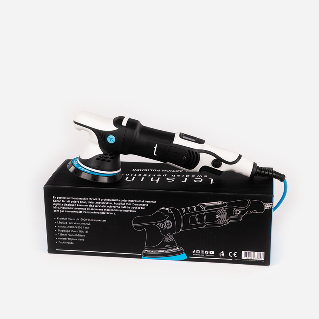 Tershine DA15 är en kraftfull oscillerande polermaskin med 1000 W motor, 15 mm slaglängd och justerbart varvtal upp till cirka 5200 rpm. Den smarta digitala displayen, LED-belysningen och mjukstartsfunktionen gör maskinen både säker och enkel att använda. Perfekt för bilvård, lackkorrigering och professionell polering hemma.